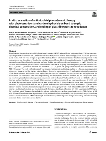 Maltarollo, Thalya Fernanda Horsth, dos Santos, Paulo Henrique, Banci, Henrique Augusto, Bachega, Mariana de Oliveira, de Oliveira, Beatriz Melare, Duarte, Marco Hungaro Antonio, Queiroz, Índia Olinta de Azevedo, Amaral, Rodrigo Rodrigues, Cintra, Luciano Angelo Tavares, Strazzi-Sahyon, Henrico Badaoui, and Sivieri-Araujo, Gustavo (2025) In vitro evaluation of antimicrobial photodynamic therapy with photosensitizers and calcium hydroxide on bond strength, chemical composition, and sealing of glass-fiber posts to root dentin. Lasers in Medical Science, 40 (1). 51.
