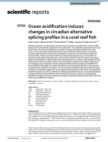 Suresh, Sneha, Jarrold, Michael, Ravasi, Timothy, Munday, Philip L., and Schunter, Celia (2025) Ocean acidification induces changes in circadian alternative splicing profiles in a coral reef fish. Scientific Reports, 15 (1). 22107.