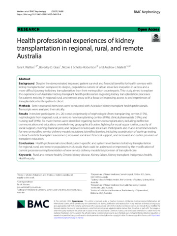Watters, Tara K., Glass, Beverley D., Scholes-Robertson, Nicole J., and Mallett, Andrew J. (2025) Health professional experiences of kidney transplantation in regional, rural, and remote Australia. BMC Nephrology, 26 (1). 88.