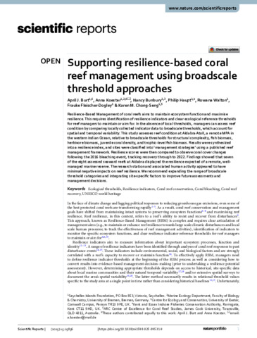 Burt, April J., Koester, Anna, Bunbury, Nancy, Haupt, Philip, Walton, Rowana, Fleischer-Dogley, Frauke, and Chong-Seng, Karen M. (2025) Supporting resilience-based coral reef management using broadscale threshold approaches. Scientific Reports, 15 (1). 25836.