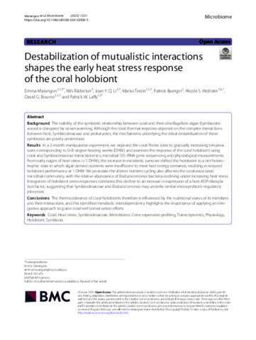 Marangon, Emma, Rädecker, Nils, Li, Joan Y.Q., Terzin, Marko, Buerger, Patrick, Webster, Nicole S., Bourne, David G., and Laffy, Patrick W. (2025) Destabilization of mutualistic interactions shapes the early heat stress response of the coral holobiont. Microbiome, 13 (1). 31.