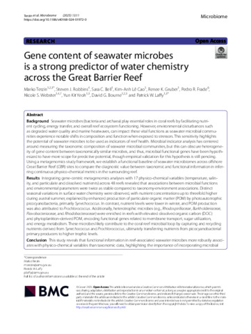 Terzin, Marko, Robbins, Steven J., Bell, Sara C., Lê Cao, Kim Anh, Gruber, Renee K., Frade, Pedro R., Webster, Nicole S., Yeoh, Yun Kit, Bourne, David G., and Laffy, Patrick W. (2025) Gene content of seawater microbes is a strong predictor of water chemistry across the Great Barrier Reef. Microbiome, 13 (1). 11.