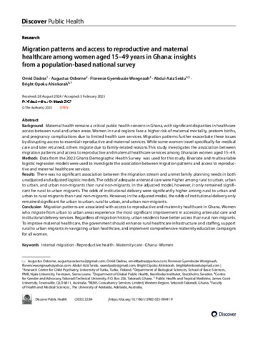 Dadras, Omid, Osborne, Augustus, Wongnaah, Florence Gyembuzie, Seidu, Abdul-Aziz, and Ahinkorah, Bright (2025) Migration patterns and access to reproductive and maternal healthcare among women aged 15–49 years in Ghana: insights from a population-based national survey. Discover Public Health, 22 (1). 84.