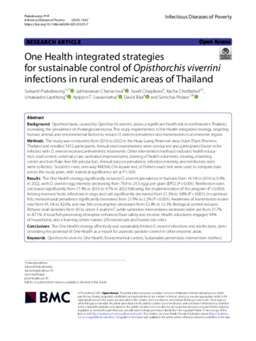 Prakobwong, Suksanti, Charoensuk, Lakhanawan, Chaipibool, Suwit, Chedtabud, Kacha, Laothong, Umawadee, Suwannatrai, Apiporn T., Blair, David, and Pinlaor, Somchai (2025) One Health integrated strategies for sustainable control of Opisthorchis viverrini infections in rural endemic areas of Thailand. Infectious Diseases of Poverty, 14 (1). 42.