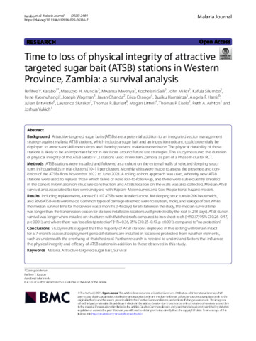Karabo, Refilwe Y., Mundia, Masuzyo H., Mwenya, Mwansa, Saili, Kochelani, Miller, John, Silumbe, Kafula, Kyomuhangi, Irene, Wagman, Joseph, Chanda, Javan, Orange, Erica, Hamainza, Busiku, Harris, Angela F., Entwistle, Julian, Slutsker, Laurence, Burkot, Thomas R., Littrell, Megan, Eisele, Thomas P., Ashton, Ruth A., and Yukich, Joshua (2025) Time to loss of physical integrity of attractive targeted sugar bait (ATSB) stations in Western Province, Zambia: a survival analysis. Malaria Journal, 24 (1). 84.