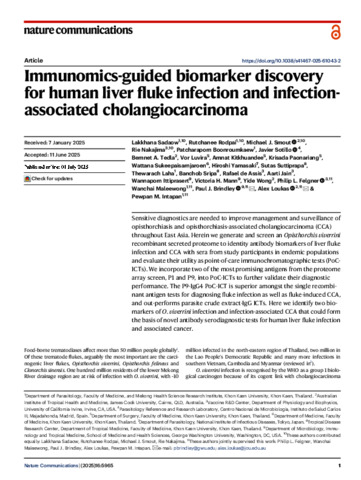 Sadaow, Lakkhana, Rodpai, Rutchanee, Smout, Michael J., Nakajima, Rie, Boonroumkaew, Patcharaporn, Sotillo, Javier, Tedla, Bemnet A., Luvira, Vor, Kitkhuandee, Amnat, Paonariang, Krisada, Sukeepaisarnjaroen, Wattana, Yamasaki, Hiroshi, Suttiprapa, Sutas, Laha, Thewarach, Sripa, Banchob, de Assis, Rafael, Jain, Aarti, Ittiprasert, Wannaporn, Mann, Victoria H., Wong, Yide, Felgner, Philip L., Maleewong, Wanchai, Brindley, Paul J., Loukas, Alex, and Intapan, Pewpan M. (2025) Immunomics-guided biomarker discovery for human liver fluke infection and infection-associated cholangiocarcinoma. Nature Communications, 16 (1). 5965.