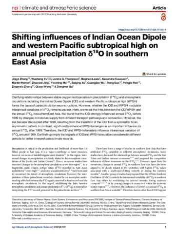 Zhang, Jingyi, Yu, Wusheng, Thompson, Lonnie G., Lewis, Stephen, Cauquoin, Alexandre, Werner, Martin, Jing, Zhaowei, Ma, Yaoming, Xu, Baiqing, Wu, Guangjian, Guo, Rong, Ren, Pengjie, Zhang, Zhuanxia, Wang, Qiaoyi, and Qu, Dongmei (2025) Shifting influences of Indian Ocean Dipole and western Pacific subtropical high on annual precipitation δ18O in southern East Asia. Npj Climate and Atmospheric Science, 8 (1). 107.