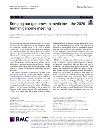 Patrinos, George P., Reichardt, Juergen K.V., Carninci, Piero, Hamosh, Ada, Mitropoulou, Christina, and Vasiliou, Vasilis (2025) Bringing our genomes to medicine – the 2026 human genome meeting. Human Genomics, 19 (1). 93.