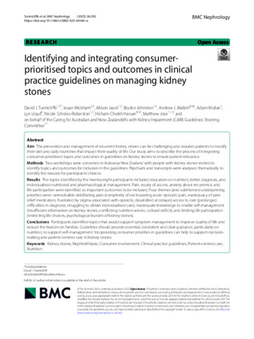 Tunnicliffe, David J., Wickham, Ieuan, Jauré, Allison, Johnston, Brydee, Mallett, Andrew J., Mullan, Adam, Lloyd, Lyn, Scholes-Roberston, Nicole, Hassan, Hicham Cheikh, and Jose, Matthew (2025) Identifying and integrating consumer-prioritised topics and outcomes in clinical practice guidelines on managing kidney stones. BMC Nephrology, 26 (1). 292.
