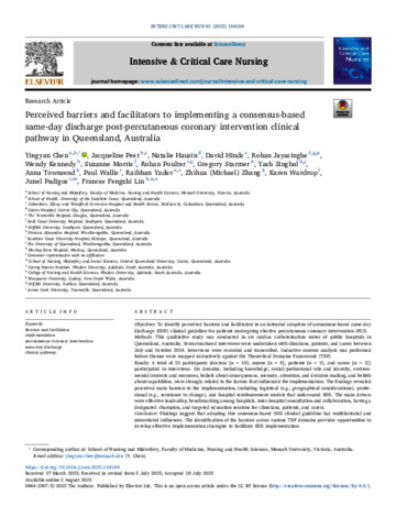 Chen, Yingyan, Peet, Jacqueline, Hausin, Natalie, Hinds, David, Jayasinghe, Rohan, Kennedy, Wendy, Morris, Suzanne, Poulter, Rohan, Starmer, Gregory, Singbal, Yash, Townsend, Anna, Wallis, Paul, Yadav, Raibhan, Zhang, Zhihua (Michael), Wardrop, Karen, Padigos, Junel, and Lin, Frances Fengzhi (2025) Perceived barriers and facilitators to implementing a consensus-based same-day discharge post-percutaneous coronary intervention clinical pathway in Queensland, Australia. Intensive and Critical Care Nursing, 91. 104169.