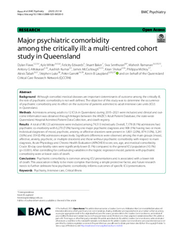 Flaws, Dylan, White, Kyle, Edwards, Felicity, Baker, Stuart, Senthuran, Siva, Ramanan, Mahesh, Attokaran, Antony G., Kumar, Aashish, McCullough, James, Shekar, Kiran, McIlroy, Philippa, Tabah, Alexis, Luke, Stephen, Garrett, Peter, and Laupland, Kevin B. (2025) Major psychiatric comorbidity among the critically ill: a multi-centred cohort study in Queensland. BMC Psychiatry, 25 (1). 118.