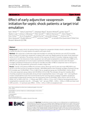 White, Kyle C., Costa-Pinto, Rahul, Blank, Sebastiaan, Whebell, Stephen, Quick, Lachlan, Luke, Stephen, Attokaran, Antony G., Garrett, Peter, Ramanan, Mahesh, Tabah, Alexis, Shekar, Kiran, Laupland, Kevin B., Kumar, Aashish, McCullough, James, Udy, Andrew, Eastwood, Glenn, Bellomo, Rinaldo, and Chaba, Anis (2025) Effect of early adjunctive vasopressin initiation for septic shock patients: a target trial emulation. Critical Care, 29 (1). 188.