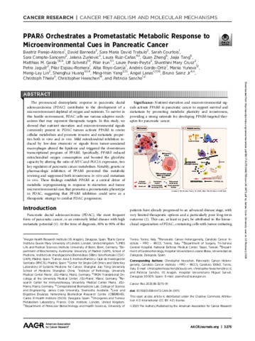 Parejo-Alonso, Beatriz, Barneda, David, Trabulo, Sara Maria David, Courtois, Sarah, Compte-Sancerni, Sara, Zurkovic, Jelena, Ruiz-Cañas, Laura, Zheng, Quan, Tang, Jiajia, Gaida, Matthias M., Schmitz, Ulf, Irun, Pilar, Penin-Peyta, Laure, Crusz, Shanthini Mary, Jagušt, Petra, Espiau-Romera, Pilar, Royo-García, Alba, Gordo-Ortiz, Andrés, Yuneva, Mariia, Lin, Meng Lay, Huang, Shenghui, Yang, Ming Hsin, Lanas, Angel, Sainz, Bruno, Thiele, Christoph, Heeschen, Christopher, and Sancho, Patricia (2025) PPARδ Orchestrates a Prometastatic Metabolic Response to Microenvironmental Cues in Pancreatic Cancer. Cancer research, 85 (17). pp. 3275-3291.