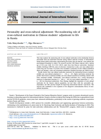 Muzychenko, Yulia, and Morozova, Olga (2025) Personality and cross-cultural adjustment: The moderating role of cross-cultural motivation in Chinese students' adjustment to life in Russia. International Journal of Intercultural Relations, 108. 102231.