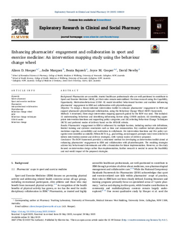 Hooper, Alison D., Marquez, Jodie, Bajorek, Beata, Cooper, Joyce M., and Newby, David (2025) Enhancing pharmacists' engagement and collaboration in sport and exercise medicine: An intervention mapping study using the behaviour change wheel. Exploratory Research in Clinical and Social Pharmacy, 19. 100619.