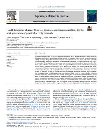 Simpson, Aaron, Beauchamp, Mark R., Dimmock, James, Willis, Claire, and Jackson, Ben (2025) Health behaviour change: Theories, progress, and recommendations for the next generation of physical activity research. Psychology of Sport and Exercise, 80. 102918.