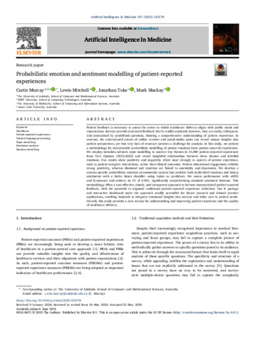 Murray, Curtis, Mitchell, Lewis, Tuke, Jonathan, and Mackay, Mark (2025) Probabilistic emotion and sentiment modelling of patient-reported experiences. Artificial Intelligence in Medicine, 167. 103178.