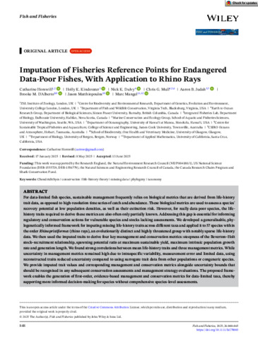 Horswill, Catharine, Kindsvater, Holly K., Dulvy, Nick K., Mull, Chris G., Judah, Aaron B., D'Alberto, Brooke M., Matthiopoulos, Jason, and Mangel, Marc (2025) Imputation of Fisheries Reference Points for Endangered Data-Poor Fishes, With Application to Rhino Rays. Fish and Fisheries, 26 (5). pp. 848-865.