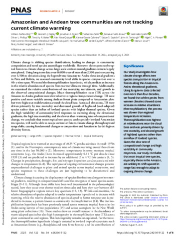 Farfan-Rios, William, Feeley, Kenneth J., Myers, Jonathan A., Tello, Sebastian, Sallo-Bravo, Jhonatan, Malhi, Yadvinder, Phillips, Oliver L., Baker, Timothy R., Nina-Quispe, Alex, Garcia-Cabrera, Karina, Saatchi, Sasan S., Terborgh, John W., Pitman, Nigel C.A., Monteagudo Mendoza, Abel Lorenzo, Vasquez, Rodolfo, Salinas, Norma, Cayola, Leslie, Fuentes Claros, Alfredo, Loza, Maria I., Nuñez Vargas, Percy, and Silman, Miles R. (2025) Amazonian and Andean tree communities are not tracking current climate warming. Proceedings of the National Academy of Sciences of the United States of America, 122 (34). e2425619122.