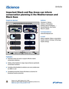 Rohner, Christoph A., Richardson, Anthony J., García-Rodríguez, Emiliano, Charles, Ryan, Batlle-Morera, Amanda, Bortoluzzi, Jenny R., Mouton, Théophile L., Notarbartolo di Sciara, Giuseppe, Armstrong, Asia O., Everett, Jason D., Bakiu, Rigers, Barash, Adi, Bariche, Michel, Başusta, Nuri, Bousquet, Caroline, Ćetković, Ilija, Giovos, Ioannis, Guallart, Javier, Milazzo, Marco, Morey, Gabriel, Naasan Aga-Spyridopoulou, Roxani, Niedermueller, Simone, Serena, Fabrizio, Shakman, Esmail, Soldo, Alen, and Jabado, Rima W. (2025) Important Shark and Ray Areas can inform conservation planning in the Mediterranean and Black Seas. iScience, 28 (8). 113192.