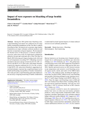 Reymond, Claire E., Romo, Caroline, Posiunaite, Gabija, Byrne, Maria, and Webster, Jody M. (2025) Impact of wave exposure on bleaching of large benthic foraminifera. Coral Reefs, 44 (4). pp. 1419-1426.