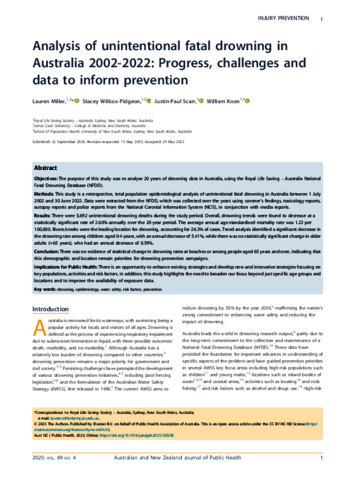Miller, Lauren, Willcox-Pidgeon, Stacey, Scarr, Justin Paul, and Koon, William (2025) Analysis of unintentional fatal drowning in Australia 2002-2022: Progress, challenges and data to inform prevention. Australian and New Zealand Journal of Public Health, 49 (4). 100258.