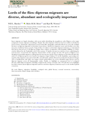 Hawkes, Will L., Menz, Myles H.M., and Wotton, Karl R. (2025) Lords of the flies: dipteran migrants are diverse, abundant and ecologically important. Biological Reviews, 100 (4). pp. 1635-1659.