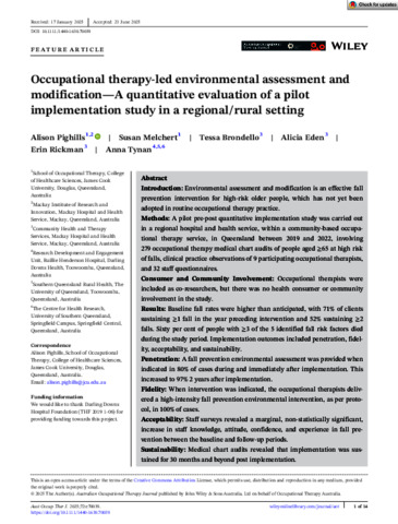 Pighills, Alison, Melchert, Susan, Brondello, Tessa, Eden, Alicia, Rickman, Erin, and Tynan, Anna (2025) Occupational therapy-led environmental assessment and modification—A quantitative evaluation of a pilot implementation study in a regional/rural setting. Australian Occupational Therapy Journal, 72 (4). e70039.
