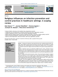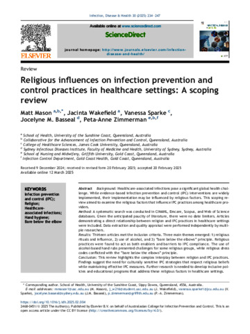 Mason, Matt, Wakefield, Jacinta, Sparke, Vanessa, Basseal, Jocelyne M., and Zimmerman, Peta Anne (2025) Religious influences on infection prevention and control practices in healthcare settings: A scoping review. Infection, Disease & Health, 30 (3). pp. 234-247.