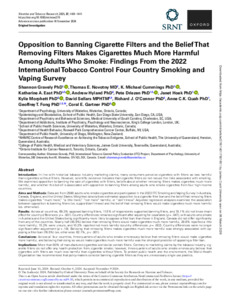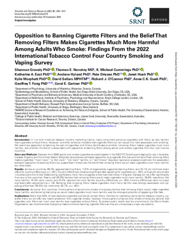 Gravely, Shannon, Novotny, Thomas E., Cummings, K. Michael, East, Katherine A., Hyland, Andrew, Driezen, Pete, Hoek, Janet, Morphett, Kylie, Sellars, David, O'Connor, Richard J., Quah, Anne C.K., Fong, Geoffrey T., and Gartner, Coral E. (2025) Opposition to Banning Cigarette Filters and the Belief That Removing Filters Makes Cigarettes Much More Harmful among Adults Who Smoke: Findings from the 2022 International Tobacco Control Four Country Smoking and Vaping Survey. Nicotine and Tobacco Research, 27 (8). pp. 1401-1411.