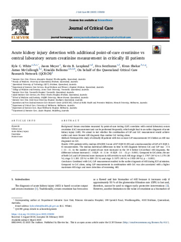 White, Kyle C., Meyer, Jason, Laupland, Kevin B., Senthuran, Siva, Shekar, Kiran, McCullough, James, and Bellomo, Rinaldo (2025) Acute kidney injury detection with additional point-of-care creatinine vs central laboratory serum creatinine measurement in critically ill patients. Journal of Critical Care, 88. 155050.