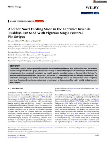 Ebner, Brendan C., and Morgan, David L. (2025) Another Novel Feeding Mode in the Labridae: Juvenile Tuskfish Fan Sand With Vigorous Single Pectoral Fin Swipes. Marine Ecology, 46 (4). e70034.