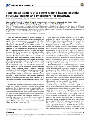 Raffaelli, Tiziano, Wilson, David T., Mobli, Mehdi, Smout, Michael J., Zhao, Guangzu, Takjoo Chelaras, Rozita, Bansal, Paramjit S., Yu, Rilei, Zhang, Zixuan, Loukas, Alex, and Daly, Norelle L. (2025) Topological isomers of a potent wound healing peptide: Structural insights and implications for bioactivity. Journal of Biological Chemistry, 301 (7). 110340.
