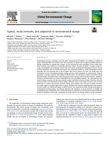 Barnes, Michele L., Sutcliffe, Sarah, Muly, Innocent, Muthiga, Nyawira, Wanyonyi, Stephen, Matous, Petr, and Murunga, Michael (2025) Agency, social networks, and adaptation to environmental change. Global Environmental Change, 92. 102983.