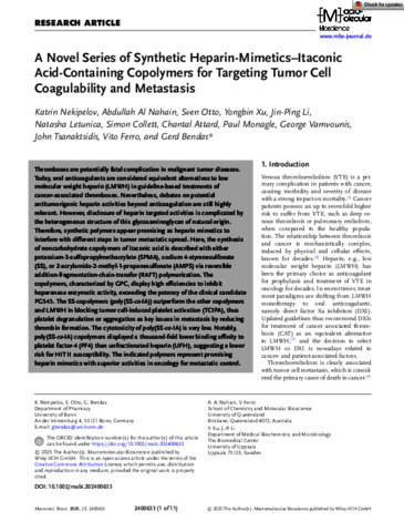 Nekipelov, Katrin, Nahain, Abdullah Al, Otto, Sven, Xu, Yongbin, Li, Jin Ping, Letunica, Natasha, Collett, Simon, Attard, Chantal, Monagle, Paul, Vamvounis, George, Tsanaktsidis, John, Ferro, Vito, and Bendas, Gerd (2025) A Novel Series of Synthetic Heparin-Mimetics–Itaconic Acid-Containing Copolymers for Targeting Tumor Cell Coagulability and Metastasis. Macromolecular Bioscience, 25 (7). 2400633.