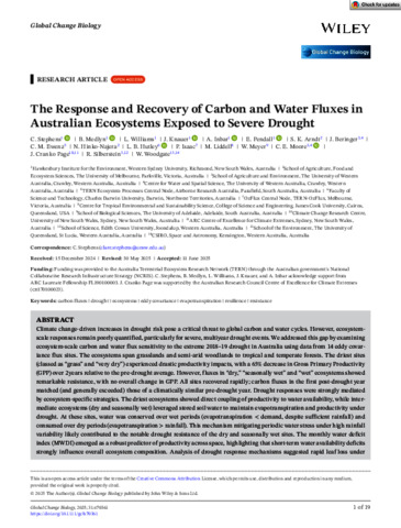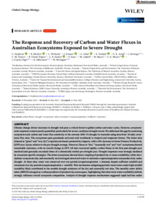 Stephens, C., Medlyn, B., Williams, L., Knauer, J., Inbar, A., Pendall, E., Arndt, S. K., Beringer, J., Ewenz, C. M., Hinko-Najera, N., Hutley, L. B., Isaac, P., Liddell, M., Meyer, W., Moore, C. E., Cranko Page, J., Silberstein, R., and Woodgate, W. (2025) The Response and Recovery of Carbon and Water Fluxes in Australian Ecosystems Exposed to Severe Drought. Global Change Biology, 31 (7). e70361.