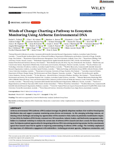 Tulloch, Rachel L., Adams, Clare I.M., Barnes, Matthew A., Clare, Elizabeth L., van de Ven, Henrik C., Cridge, Andrew, Encinas-Viso, Francisco, Fernandes, Kristen, Gleeson, Dianne M., Hill, Erin, Hopkins, Anna J.M., Kearns, Anna M., Kroos, Gracie C., MacDonald, Anna J., Martoni, Francesco, McGaughran, Angela, McLay, Todd G.B., Neaves, Linda E., Nevill, Paul, Pugh, Andrew, Robinson, Kye J., Roger, Fabian, Steinrucken, Tracey V., van der Heyde, Mieke, Villacorta-Rath, Cecilia, Vivian, Jenny, and Hahn, Erin E. (2025) Winds of Change: Charting a Pathway to Ecosystem Monitoring Using Airborne Environmental DNA. Environmental DNA, 7 (4). e70134.