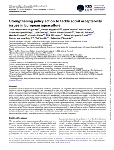 Agúndez, José Antonio Pérez, Filgueira, Ramón, Ahmed, Nesar, Asif, Furqan, Billing, Suzannah Lynn, Fanning, Lucia, Himes-Cornell, Amber, Johnson, Teresa R., Krause, Gesche, Kreiss, Cornelia, Mikkelsen, Eirik, Stead, Selina Marguerite, van den Burg, Sander, Vecchio, Yari, and Villasante, Sebastian (2025) Strengthening policy action to tackle social acceptability issues in European aquaculture. ICES Journal of Marine Science, 82 (7). fsaf100.