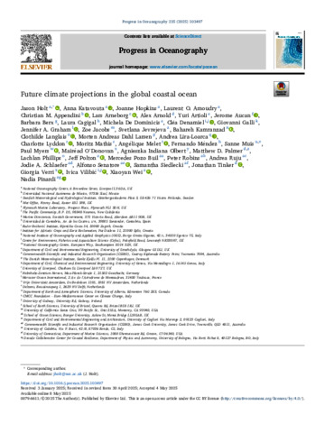 Holt, Jason, Katavouta, Anna, Hopkins, Joanne, Amoudry, Laurent O., Appendini, Christian M., Arneborg, Lars, Arnold, Alex, Artioli, Yuri, Aucan, Jerome, Berx, Barbara, Cagigal, Laura, Dominicis, Michela De, Denamiel, Cléa, Galli, Giovanni, Graham, Jennifer A., Jacobs, Zoe, Jevrejeva, Svetlana, Kamranzad, Bahareh, Langlais, Clothilde, Larsen, Morten Andreas Dahl, Lira-Loarca, Andrea, Lyddon, Charlotte, Mathis, Moritz, Melet, Angélique, Méndez, Fernando, Muis, Sanne, Myers, Paul, O'Donovan, Mairéad, Olbert, Agnieszka Indiana, Palmer, Matthew D., Phillips, Lachlan, Polton, Jeff, Buil, Mercedes Pozo, Robins, Peter, Ruju, Andrea, Schlaefer, Jodie A., Senatore, Alfonso, Siedlecki, Samantha, Tinker, Jonathan, Verri, Giorgia, Vilibić, Ivica, Wei, Xiaoyan, and Pinardi, Nadia (2025) Future climate projections in the global coastal ocean. Progress in Oceanography, 235. 103497.