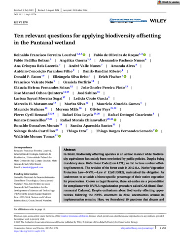 Lourival, Reinaldo Francisco Ferreira, de Oliveira Roque, Fabio, Bolzan, Fábio Padilha, Guerra, Angélica, Nunes, Alessandro Pacheco, Lacerda, Ana Cristyna Reis, Nunes, André Valle, Alves, Amanda, Filho, Antônio Conceição Paranhos, Ribeiro, Danilo Bandini, Eaton, Donald P., Brito, Elizângela Silva, Fischer, Erich, Neto, Francisco Valente, Porfirio, Grasiela, Seixas, Gláucia Helena Fernandes, Pinto, João Onofre Pereira, Quintero, Jose Manuel Ochoa, Sabino, José, Sugai, Larissa Sayuri Moreira, Garcia, Leticia Couto, Matsumoto, Marcelo H., Silva, Mariza, Almeida-Gomes, Mauricio, Stefanes, Mauricio, Mills, Morena, Pays, Olivier, Renaud, Pierre Cyril, Loyola, Rafael Dias, Guariento, Rafael Dettogni, Crouzeilles, Renato, Chiaravalloti, Rafael Morais, Morato, Ronaldo Gonsalves, Santos, Sandra Aparecida, Ikeda-Castrillon, Solange, Izzo, Thiago, Semedo, Thiago Borges Fernandes, and Tomas, Walfrido Moraes (2025) Ten relevant questions for applying biodiversity offsetting in the Pantanal wetland. Conservation Science and Practice, 7 (7). e13274.
