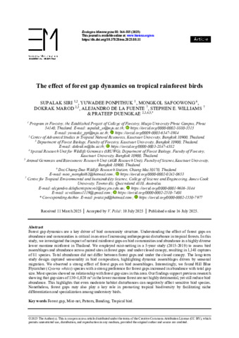 Siri, Supalak, Ponpithuk, Yuwadee, Safoowong, Mongkol, Marod, Dokrak, de la Fuente Pinero, Alejandro, Williams, Stephen E., and Duengkae, Prateep (2025) The effect of forest gap dynamics on tropical rainforest birds. Ecologica Montenegrina, 88. pp. 164-185.