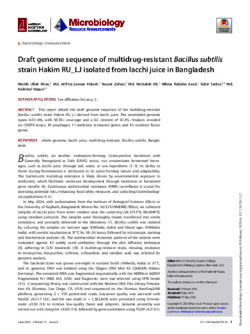 Khan, Muhib Ullah, Polash, Md Arif Uz Zaman, Zahan, Nusrat, Ali, Md Mottaleb, Azad, Nilima Rubaba, Sarker, Subir, and Haque, Md Hakimul (2025) Draft genome sequence of multidrug-resistant Bacillus subtilis strain Hakim RU_LJ isolated from lacchi juice in Bangladesh. Microbiology Resource Announcements, 14 (6). e00278-25.