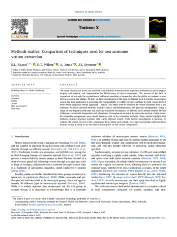 Kaposi, K.L., Wilson, D.T., Jones, A., and Seymour, J.E. (2025) Methods matter: Comparison of techniques used for sea anemone venom extraction. Toxicon: X, 26. 100219.