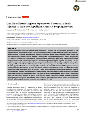 Bosley, Lauren, Gibbs, Clinton, Joo, Eunah, and Dobson, Geoffrey (2025) Can Non-Neurosurgeons Operate on Traumatic Brain Injuries in Non-Metropolitan Areas? A Scoping Review. Emergency Medicine Australasia, 37 (3). e70055.