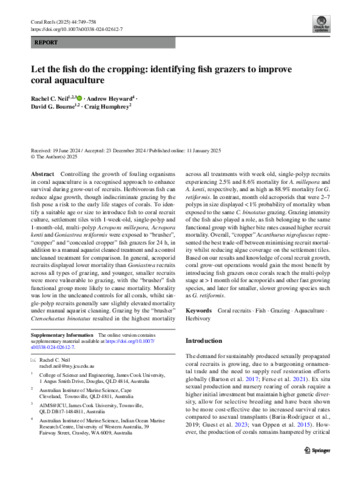 Neil, Rachel C., Heyward, Andrew, Bourne, David G., and Humphrey, Craig (2025) Let the fish do the cropping: identifying fish grazers to improve coral aquaculture. Coral Reefs, 44 (3). 143897. pp. 749-758.