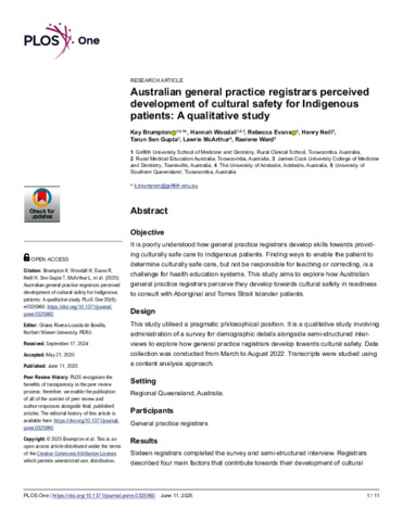 Brumpton, Kay, Woodall, Hannah, Evans, Rebecca, Neill, Henry, Sen Gupta, Tarun, McArthur, Lawrie, and Ward, Raelene (2025) Australian general practice registrars perceived development of cultural safety for Indigenous patients: A qualitative study. PLoS ONE, 20 (6 June). e0325960.