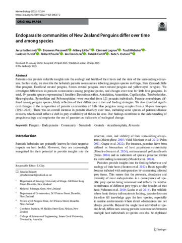 Bennett, Jerusha, Presswell, Bronwen, Little, Mikey, Lagrue, Clement, Webster, Trudi, Dutoit, Ludovic, Poulin, Robert, Davidson, Ian, Cahill, Patrick, and Hutson, Kate S. (2025) Endoparasite communities of New Zealand Penguins differ over time and among species. Marine Biology, 172 (6). 94.