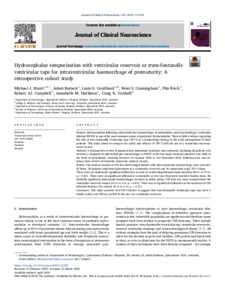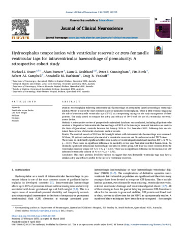 Stuart, Michael J., Burnett, Adam, Coulthard, Liam G., Cunningham, Peter S., Birch, Pita, Campbell, Robert AJ, Harbison, Annabelle M., and Vonhoff, Craig R. (2025) Hydrocephalus temporisation with ventricular reservoir or trans-fontanelle ventricular taps for intraventricular haemorrhage of prematurity: A retrospective cohort study. Journal of Clinical Neuroscience, 136. 111225.