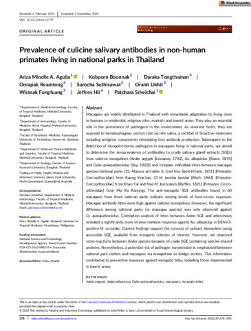 Aguila, Ariza Minelle A., Boonnak, Kobporn, Tongthainan, Daraka, Reamtong, Onrapak, Suthisawat, Sarocha, Likhit, Oranit, Fungfuang, Wirasak, Hii, Jeffrey, and Sriwichai, Patchara (2025) Prevalence of culicine salivary antibodies in non-human primates living in national parks in Thailand. Medical and Veterinary Entomology, 39 (2). pp. 278-290.