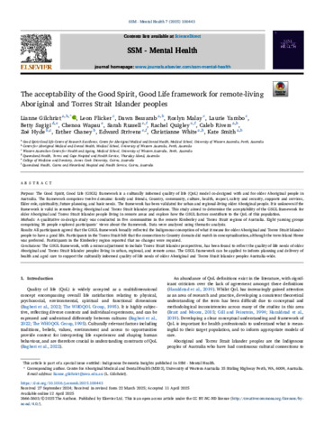 Gilchrist, Lianne, Flicker, Leon, Bessarab, Dawn, Malay, Roslyn, Yambo, Laurie, Sagigi, Betty, Wapau, Chenoa, Russell, Sarah G, Quigley, Rachel, Rivers, Caleb, Hyde, Zoë, Chaney, Esther, Strivens, Eddy, White, Christianne, and Smith, Kate (2025) The acceptability of the Good Spirit, Good Life framework for remote-living Aboriginal and Torres Strait Islander peoples. SSM - Mental Health, 7. 100443.